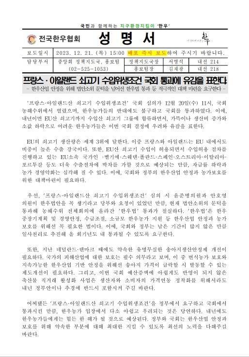 20일 국회 본회의에서 ‘프랑스·아일랜드산 쇠고기 수입위생조건안 심의결과보고서 채택의 건’이 처리됨에 따라 전국한우협회는 최근 성명을 내고 유감을 표했다.