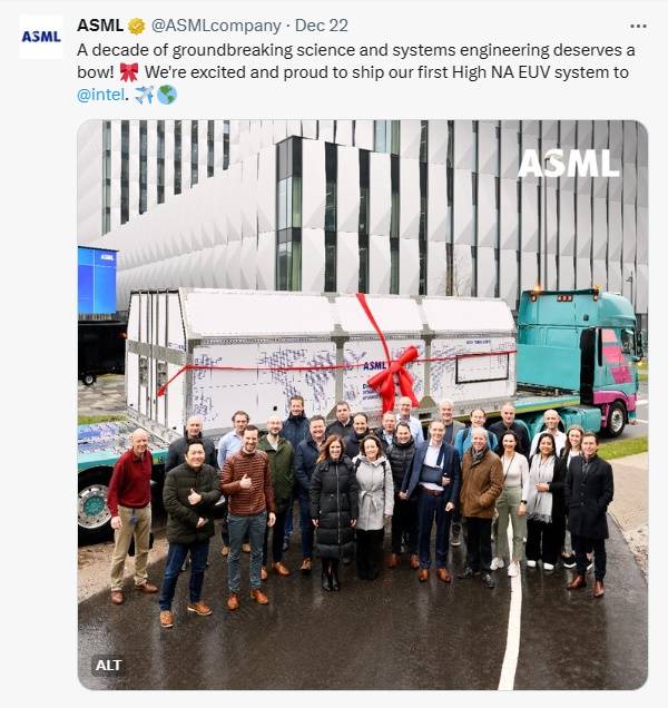 | ▲ ASML의 X에 공개된 차세대 EUV장비 출하 소식. 인텔은 ASML과 손잡고 하이-NA EUV를 공동개발에 적극 나섰습니다. 그 결과 첫 장비는 인텔로 향하게 된 겁니다. |