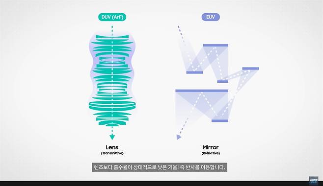 일반적으로 똑같이 렌즈라고 부르기는 하지만 DUV는 돋보기 형태의 렌즈를 이용해 빛을 투과시키고, EUV는 반사경 형태의 렌즈를 이용해 빛을 반사시킵니다. EUV에서 렌즈를 키우면 반사경이 받아들이는 입사광과 내보내는 반사광에 간섭이 생기기 때문에 빛 간섭을 피하며 렌즈를 최대로 키우는 것이 기술입니다.