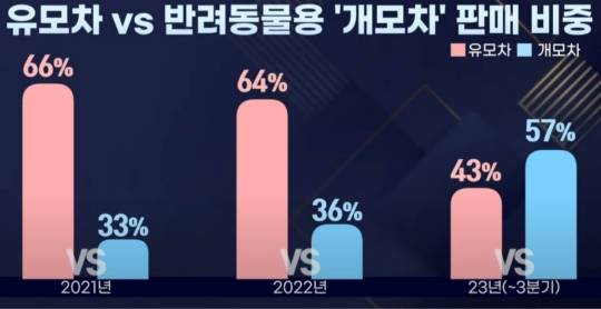 적어도 온라인 시장에서는 그렇습니다. 올해 3분기까지 반려동물용 유모차 판매량이 최초로 유아용 유모차를 넘어섰다는 통계가 나왔습니다. 온라인 오픈마켓 G마켓에 따르면 개모차와 유아용 유모차의 합계 판매량을 100으로 계산할 때 개모차의 판매 비중은 2021년 33%, 2022년 36%로 소폭 상승한 뒤 올해 1~3분기에 57%로 급증했습니다.