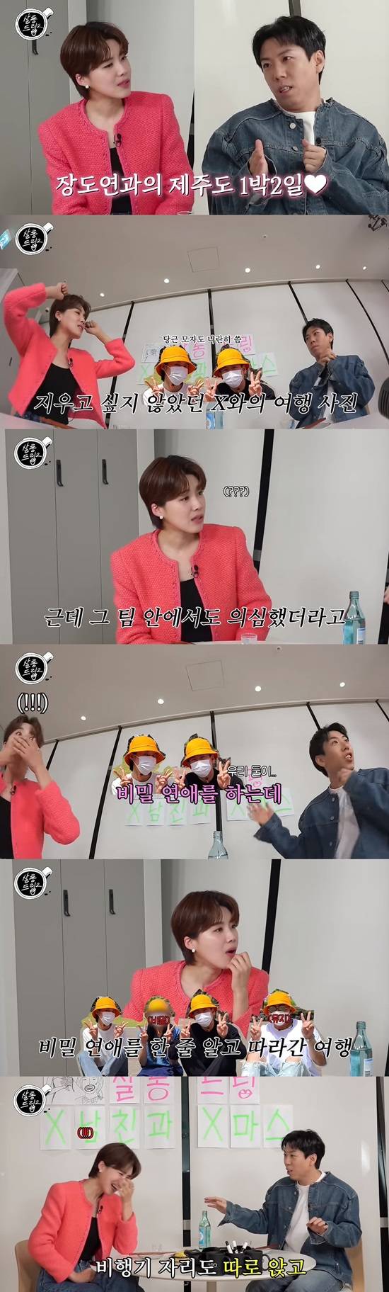 양세찬은 "장도연 누나랑 나랑 오래봤는데 사실 제주도 가는 거 이상하지 않다. 그런데 기억을 되짚어보면 비행기 자리도 따로 앉았다"며 열애설에 조심했었다고 밝혔다.