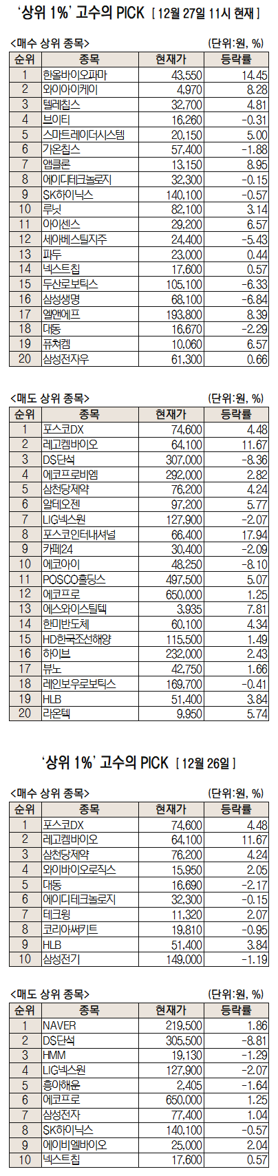 이날 미래에셋엠클럽에 따르면 미래에셋증권 주식 거래 고객 중 최근 1개월 간 투자수익률 상위 1%에 해당하는 ‘주식 초고수’들이 오전 11시까지 가장 많이 사들인 종목은 한올바이오파마로 집계됐다.
