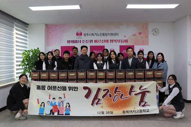충북 청주에 있는 충북여자고등학교 학생들이 연말을 맞아 5년째 자매결연을 맺고 있는 '청주시 독거노인센터'에 김치를 선물했습니다.