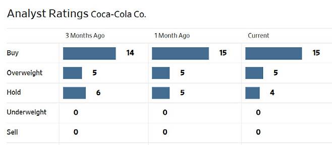 한편 월가에서 코카콜라에 대해 투자의견을 제시한 애널리스트는 총 24명으로 이 중 20명(83%)이 매수(비중확대 및 시장수익률 상회 등 포함) 의견을 유지하고 있다. 평균 목표주가는 64.92달러로 이날 종가보다 11% 높다.