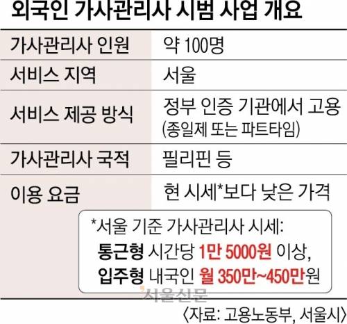 외국인 가사관리사를 둘러싼 국내 이슈 중 하나는 이용 요금이다. 시세보다 낮은 가격으로 서비스를 제공하는 방안이 추진된다.