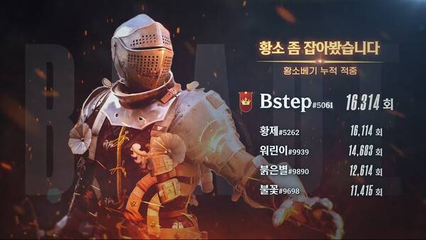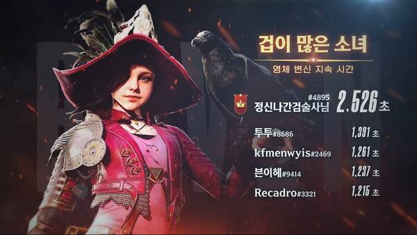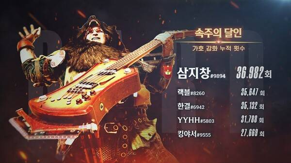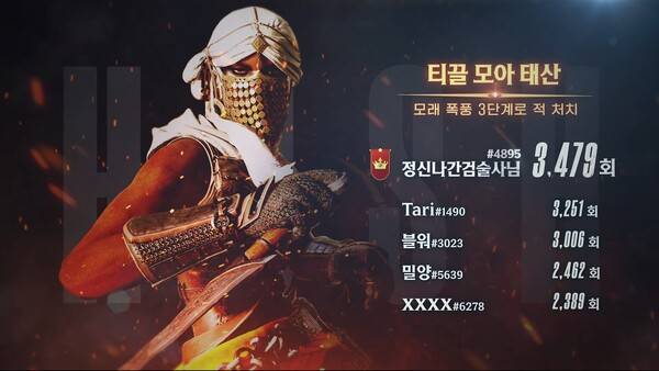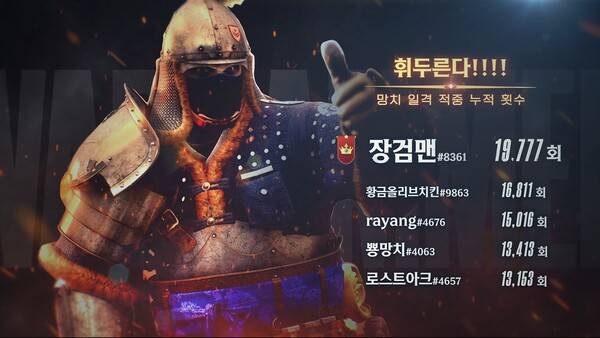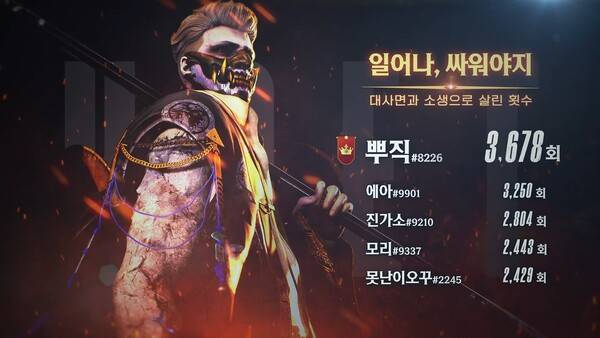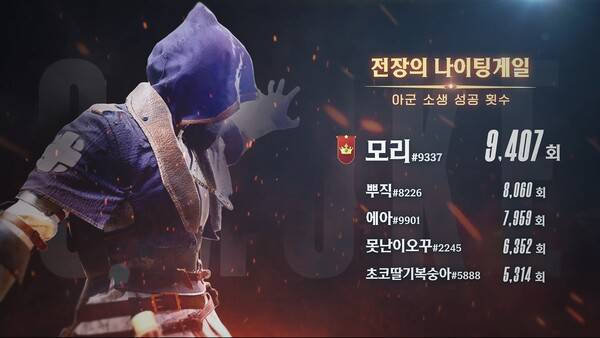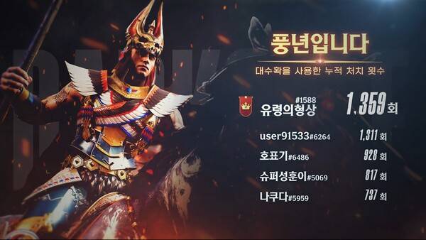 영웅 캐릭터 중에는 '먹바람'의 기술 '대수확'으로 누적 1359명을 처치하며 '풍년입니다' 부문 1위를 거머쥔 이용자 '유령의형상' 기록이 눈길을 끈다.