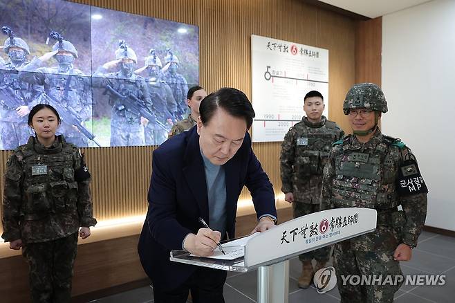(연천=연합뉴스) 진성철 기자 = 윤석열 대통령이 연말연시를 맞아 28일 경기도 연천군 중부 전선 육군 제5보병사단 열쇠전망대를 방문해 방명록을 작성하고 있다. 2023.12.28 [대통령실 제공. 재판매 및 DB 금지]