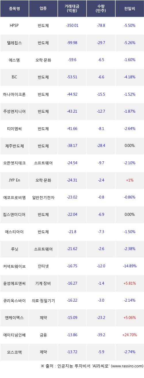 외국인 투자자의 순매도 상위 20개 종목은 HPSP, 텔레칩스, 에스엠, ISC, 하나마이크론, 주성엔지니어링, 티이엠씨, 제주반도체, 오픈엣지테크놀로지, JYP Ent.등이다.