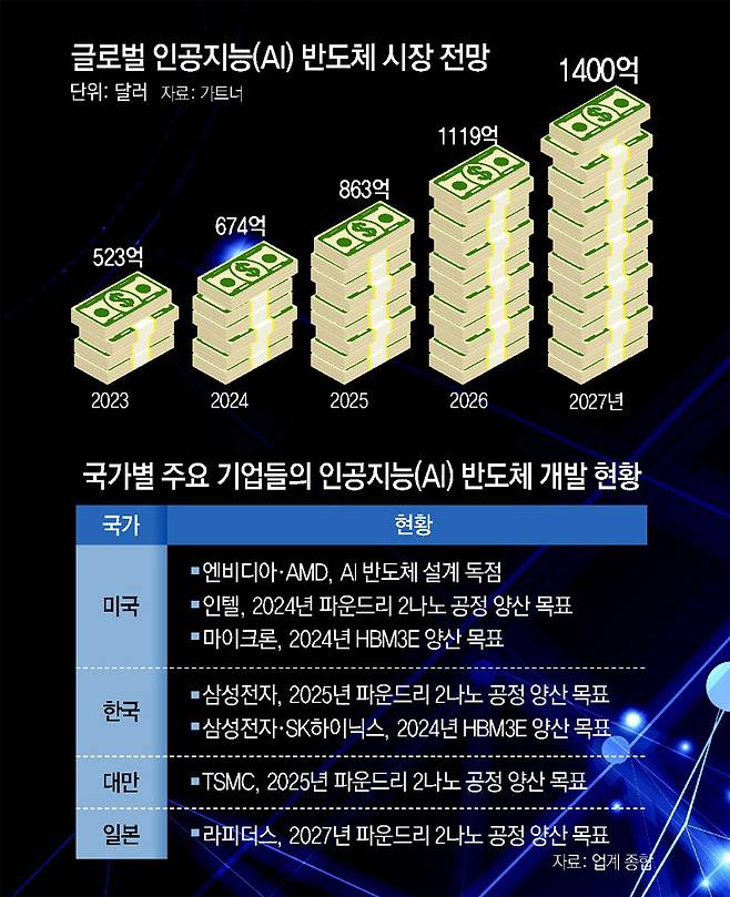 한국은 AI 반도체 시장에서 삼성전자의 파운드리, 삼성전자·SK하이닉스의 고대역폭메모리(HBM) 등 먹을거리를 일단 선점했다. 하지만 파운드리 시장에선 후발주자인 인텔, HBM은 마이크론의 추격이 거센 상황이다. 인텔은 최근 2년간 미국과 유럽 각 지역 정부 보조금을 바탕으로 130조 원이 넘는 파운드리 공장 신규 투자를 발표했다. 마이크론도 삼성전자와 SK하이닉스가 양분하고 있던 HBM 시장에서 내년 신제품 출시를 통해 도전장을 던졌다.