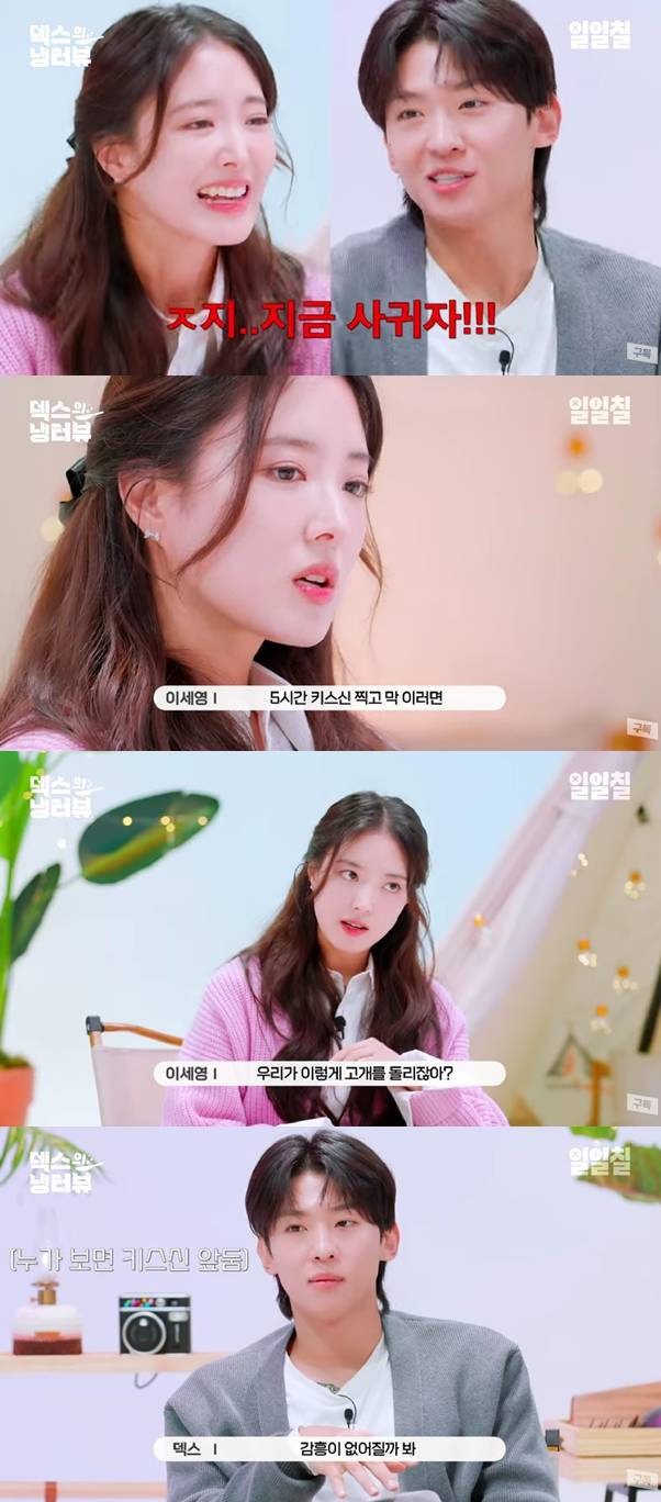 덱스는 "그런 것까지 생각하며 친구를 안 사귈 수는 없다"라며 당황해했다. 이어 "썸 탈 때 키스 가능, 불가"을 묻자 이세영은 "가능"하다며 "지금 키스를 하고 싶어. 그런데 아직 사귀기로 안했어 그러면"이라고 되물었다.