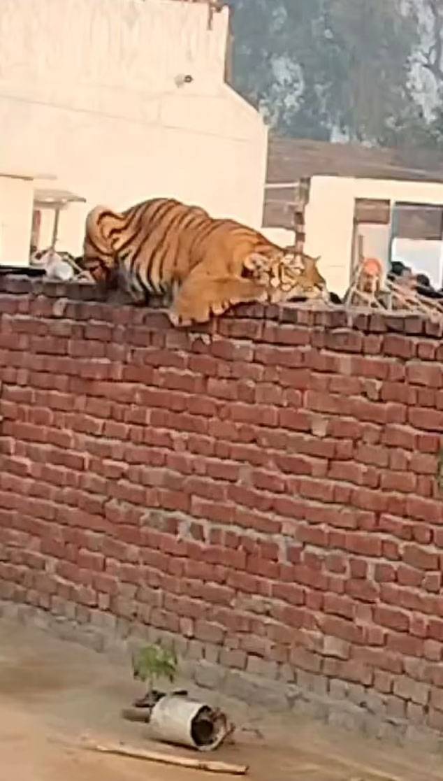 인도에서 호랑이가 마치 고양이처럼 마을 담벼락 위에 자리 잡고 엎드려 휴식을 취하는 모습이 카메라에 잡혔다.