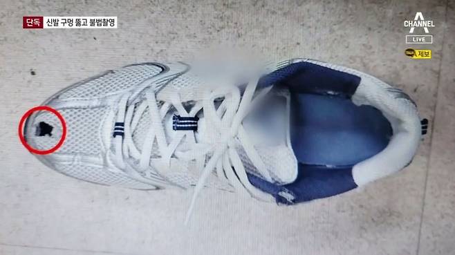 남성의 운동화 앞에는 작은 구멍이 있었고, 렌즈 직경 3cm 정도 되는 초소형카메라가 숨겨져 있었다.