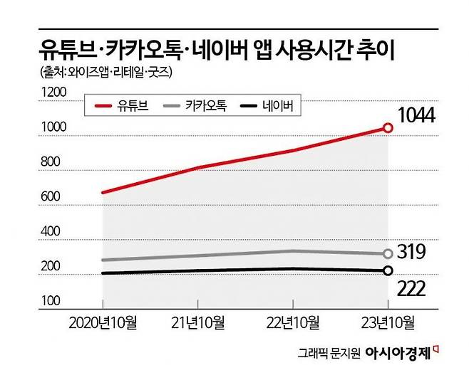 최근 한국인의 유튜브 사용 시간이 한 달에 1000억분을 넘었다는 조사 결과가 나왔다. 지난달 15일 앱·리테일 분석 서비스 와이즈앱·리테일·굿즈가 한국인 스마트폰 사용자를 표본 조사한 결과, 10월 유튜브 사용 시간은 1044억 분에 달했다고 밝혔다. 카카오톡(319억분), 네이버(222억분), 인스타그램(172억분), 틱톡(79억분) 등이 그 뒤를 이었다.