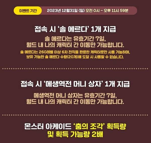 2023년 12월 31일 접속 시 지급되는 '메생역전 머니 상자' 아이템이 230레벨 이상 캐릭터로만 수령 및 사용 가능하도록 변경됐습니다. (2023년 12월 31일 오전 3시 18분 추가)