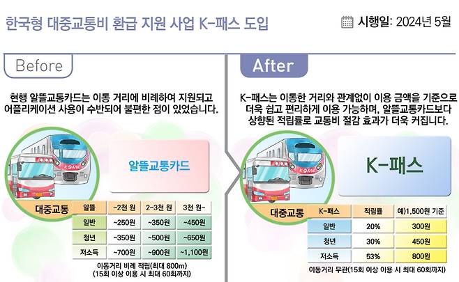 현행 알뜰교통카드는 보행·자전거 이동 거리에 비례해 지원되고, 별도의 모바일 애플리케이션(응용프로그램)을 써야 해서 이용이 불편하고 어렵다는 지적을 받아왔다. 정부는 내년도 예산안에 알뜰교통카드 336억원, K-패스에 516억원을 편성했다.