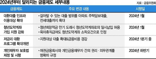 12월 31일 금융위원회는 이같은 내용을 담은 '2024년 새해부터 달라지는 제도'를 발표했다. 우선 1월부터 대환대출 인프라 대상이 기존 신용대출에서 아파트 주택담보대출, 전세대출까지 확대된다. 또 청년희망대출 만기 도래시 청년도약계좌로 일시납입을 허용하고 육아휴직 급여도 청년도약계좌 소득 요건으로 인정하기로 했다.
