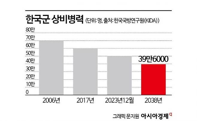 육군 기준 병 복무기간을 18개월로 유지하고 간부 규모와 현역 판정 비율, 상근·보충역 규모를 현재와 동일하게 유지한다면 연말 병력은 2038년 39만6000명을 기록하며 40만명 아래로 내려가게 된다.