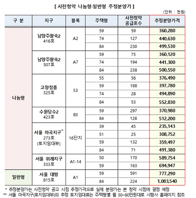 추정분양가는 일반형인 서울 대방 A1(일반형) 59㎡ 7억7729만원, 84㎡10억8350만원이다. 나눔형으로 공급되는 단지들은 ▲서울 위례지구 59㎡ 6억9495만원 ▲마곡지구 16단지 59㎡ 3억5949만원, 84㎡3억91338만원이다. 마곡지구의 경우 토지임대부 주택으로 토지 임대료가 주택형별로 월 30만~70만원대다.