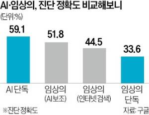 결과는 일방적이었다. AI가 혼자 진단했을 때 정확도가 59.1%로 가장 높았다. 임상의가 도움 없이 혼자 진단했을 때는 33.6%에 불과했다. 임상의가 AI의 도움을 받았을 때의 정확도는 51.8%로 AI 단독 진단에 미치지 못했다.