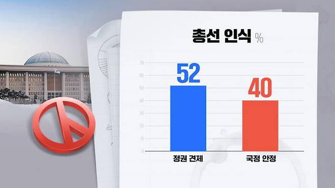 '정권 견제를 위해 야당에 힘을 실어줘야 한다' 52%, '국정 안정을 위해 여당에 힘을 실어 줘야 한다' 40%로 조사됐습니다.