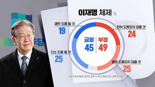 이재명 대표 체제가 민주당 총선 결과에 '도움이 될 것이다'가 45%, '도움 안 될 것이다'는 49%로, 둘 다 오차 범위 안이었습니다.
