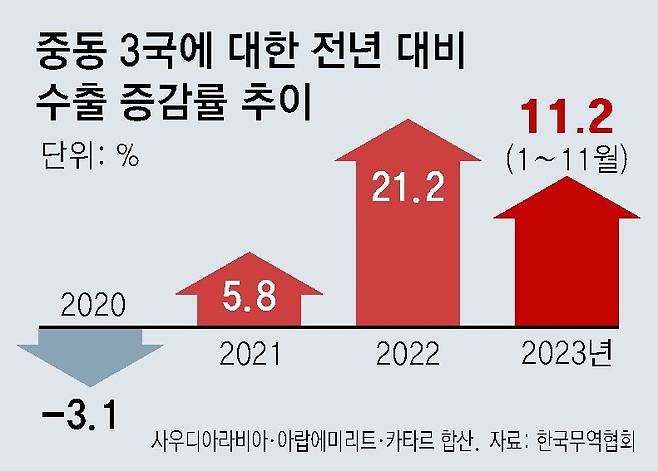 경제 전문가들은 신시장으로 중동을 주목할 필요가 있다고 조언한다. 지난해 11월까지 중동 3국(사우디, UAE, 카타르) 대상 수출액은 94억5688만 달러로 11.2% 성장했다. 2019∼2023년(11월) 약 5년간 추이를 살펴봐도 한국 전체 수출액이 6.04% 늘어나는 동안 중동 3국 대상 수출액은 25.7% 급증했다. 특히 카타르 대상 수출액은 전년 11월까지 57.9% 급증했다. 사우디도 같은 기간 11.3% 성장했고, 2022년엔 46.3% 급등하며 명실상부 신시장으로 떠올랐다. 강문수 대외경제정책연구원 아프리카중동팀장은 “최근 지정학적 리스크 속에서 수출국 다변화를 해야 하는 한국 입장에선 중동은 매우 매력적인 시장”이라고 말했다.
