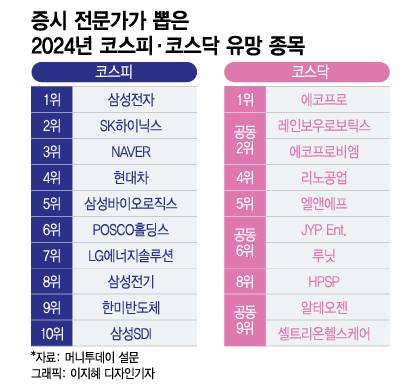 증시 전문가들은 올해 코스피 시장 유망 종목 1위로 '삼성전자'를 꼽았다. 반도체 업황 개선을 바탕으로 상승 랠리를 펼쳐갈 수 있다고 본 것이다. 코스닥 시장에서는 '에코프로'가 1위를 차지했다. 지속되는 고평가 논란에도 향후 성장성은 유효하다고 평가했다.