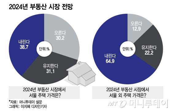 머니투데이 증권부가 지난해 11월27일부터 12월10일까지 증권사 애널리스트, 펀드매니저를 비롯해 증시 전문가 225명을 대상으로 실시한 2024년 증시 전망 설문조사에서 응답자들은 올해 주택가격 하락에 무게를 뒀다.