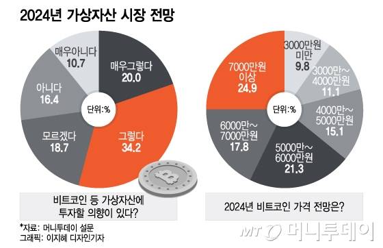 비트코인 가격은 제시된 보기 중 가장 높은 수준인 7000만원 이상으로 전망하는 의견이 24.9%로 가장 많았다. 6000만~7000만원 선으로 전망하는 의견도 17.8%였다. 인베스팅닷컴에 따르면 지난달 15일 오후 비트코인의 원화 가격이 5800만원 인근에서 형성됐는데, 이 수준보다 더 오를 것으로 전망하는 의견이 42.7%에 달했다.