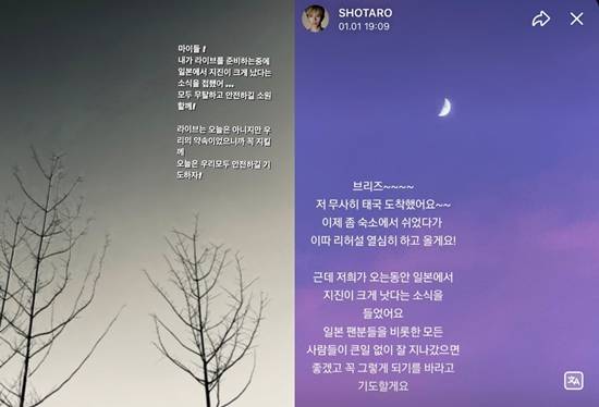 라이즈의 일본인 멤버 쇼타로는 위버스에 한국어와 일본어로 "일본에서 지진이 크게 낫다는 소식을 들었다. 일본 팬분들을 비롯한 모든 사람들이 큰일 없이 잘 지나갔으면 좋겠고 꼭 그렇게 되기를 바라고 기도한다"며 "모두 별탈없는 24년의 첫날이 되길 바란다"고 했다.
