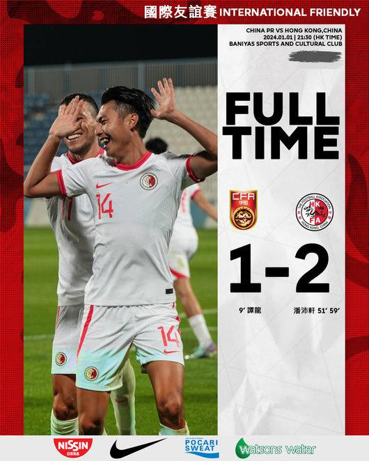 이번 경기는 FIFA가 공인한 A매치였으나 아시안컵을 앞두고 전력 노출을 피하기 위한 중국 측의 요구에 따라 비공개로 진행됐다. 홍콩 사우스차이나모닝포스트에 따르면 중국은 전반 9분 만에 베테랑 공격수 탄룽의 선제골로 앞서나갔다. 하지만 홍콩의 새로운 에이스 푼푸이힌에게 후반 6분과 14분 연속 실점을 내주며 무릎을 꿇었다.