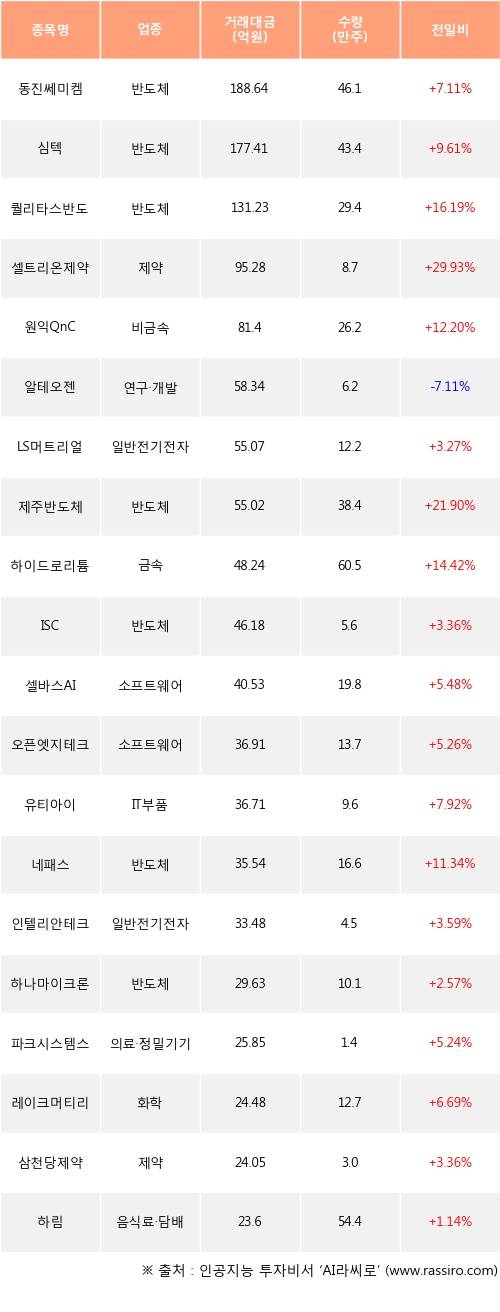 동진쎄미켐, 심텍, 퀄리타스반도체 등은 전일 대비 주가가 상승했고, 알테오젠 등은 주가가 하락했다.