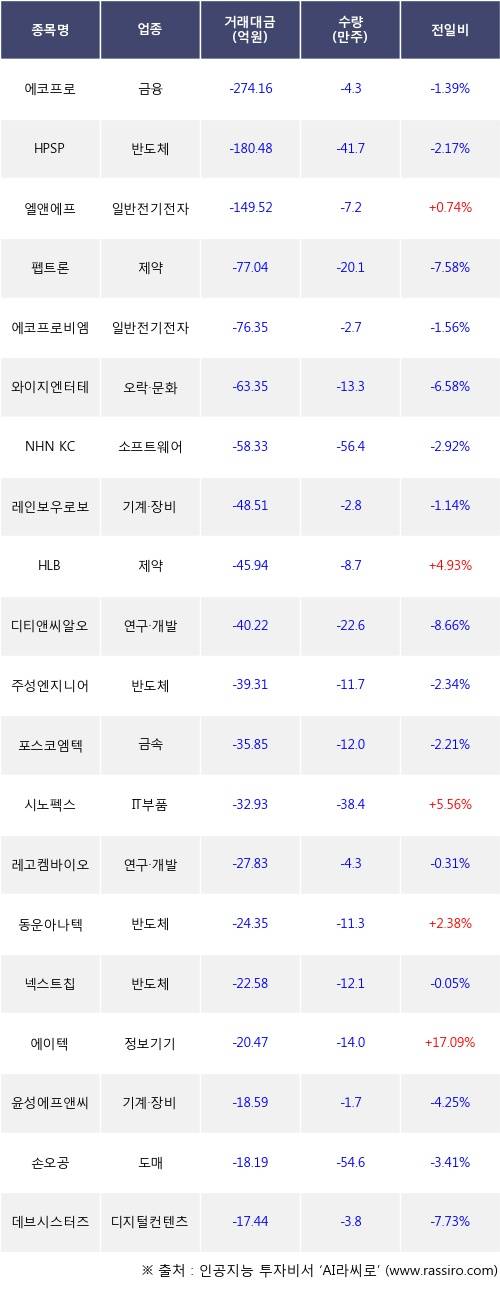 외국인 투자자의 순매도 상위 20개 종목은 에코프로, HPSP, 엘앤에프, 펩트론, 에코프로비엠, 와이지엔터테인먼트, NHN KCP, 레인보우로보틱스, HLB, 디티앤씨알오등이다.