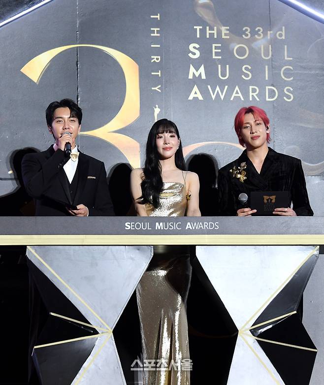 이승기(왼쪽)와 티파니 영(가운데), 뱀뱀이 2일 태국 방콕 라자망갈라 국립경기장에서 열린 ‘제33회 서울가요대상’ 시상식(주최 스포츠서울, 주관 서울가요대상 조직위원회)에서 MC를 맡아 행사를 진행하고 있다. 2024. 1. 2. 방콕(태국) | 박진업기자 upandup@sportsseul.com