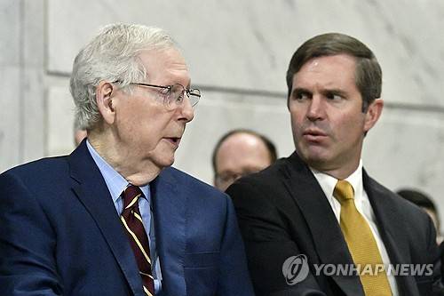 Senate Minority Leader Mitch McConnell, R-Ky., left, speaks with Kentucky Governor Andy Beshear during a ceremony in the Rotunda at the Kentucky State Capitol in Frankfort, Ky., Tuesday, Jan. 2, 2024. (AP Photo/Timothy D. Easley)