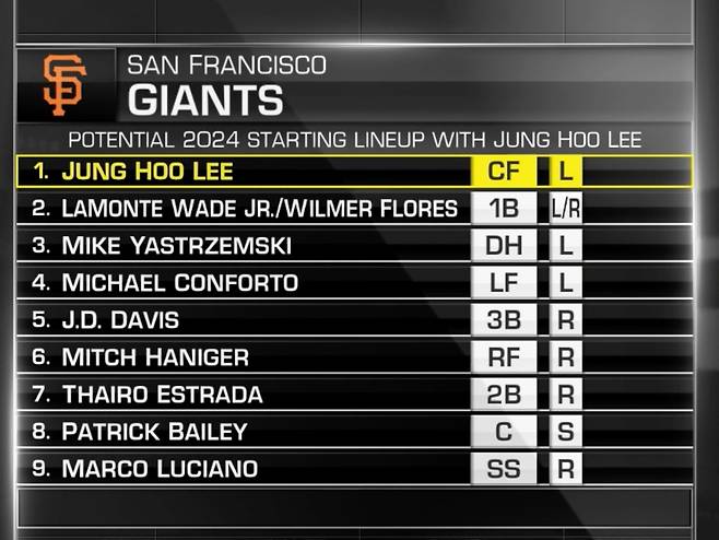 이미 미국 현지 언론은 이정후가 1번타자 겸 중견수로 개막전 라인업에 이름을 올릴 것으로 예상하고 있다. 'MLB네트워크'는 2024시즌 샌프란시스코의 타순을 예상하면서 1번타자 및 중견수로 이정후가 나서고, 라몬테 웨이드 주니어 또는 윌머 플로레스가 이정후와 테이블 세터를 이룰 것이라고 내다봤다.