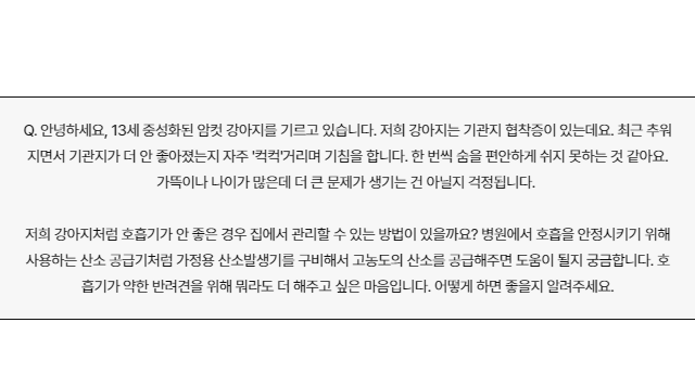 사연 속 강아지의 경우 가정용 산소 발생기를 사용하면 정말 도움이 되는지 여쭤보셨는데요. 일반적으로 기관지가 협착되면 호흡 통로인 튜브가 좁아지면서 얻을 수 있는 산소량 자체가 적어집니다. 따라서 혀나 잇몸이 파래지는 청색증이 나타날 수 있죠. 이 경우 말씀하신 부분처럼 가정용 산소 발생기가 도움이 될 수 있습니다.