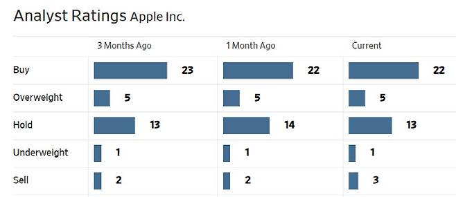 한편 애플에 대해 투자의견을 제시한 월가 애널리스트 44명 중 27명(61.4%)이 매수(비중확대 및 시장수익률 상회 등 포함) 의견을 유지하고 있다. 평균 목표주가는 197.92달러로 이날 종가보다 6.6% 높다.