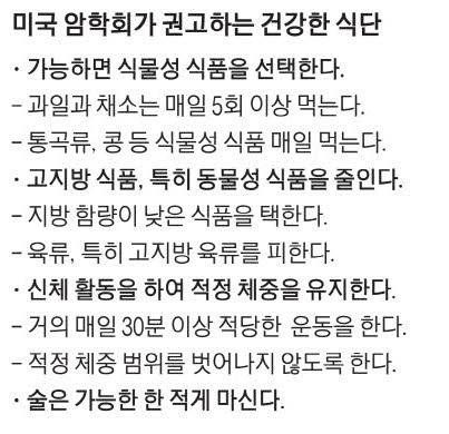 식사는 채소와 고기를 먹는 게 바람직하다. 김 교수는 "채식이나 육식에는 각각 장점이 있는 것이 사실이다. 하지만 어느 한쪽으로 치우치면 장점보다 단점이 더 커진다는 것이 지금까지 연구 결과"라며 "△하루에 채소·과일을 각각 5가지 이상 먹을 것 △탄수화물을 섭취하되 통곡물(현미·통밀 등)을 위주로 먹을 것 △단백질은 붉은 고기보다 생선, 가금류, 콩류, 달걀 등으로 섭취할 것 △우유와 유제품을 먹을 것 △견과류를 하루에 한 줌 정도 먹을 것 등을 강조하는 '건강한 식단'이 제시되고 있다"고 설명했다.