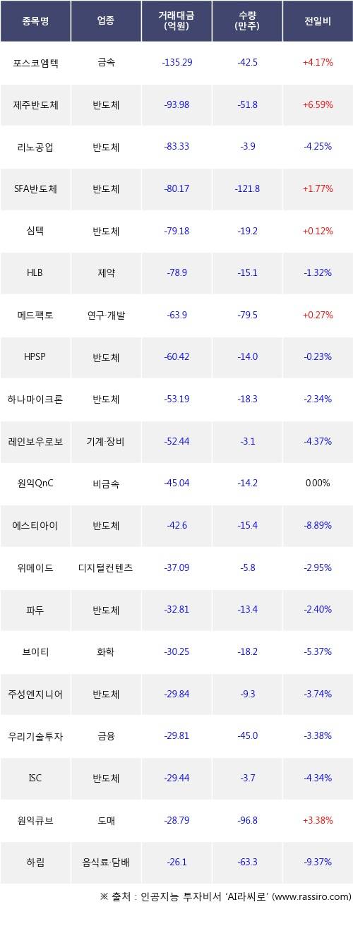 외국인 투자자의 순매도 상위 20개 종목은 포스코엠텍, 제주반도체, 리노공업, SFA반도체, 심텍, HLB, 메드팩토, HPSP, 하나마이크론, 레인보우로보틱스등이다.