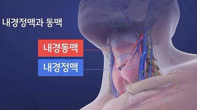 [조동찬/의학전문기자(전문의) : 머리에서 심장으로 내려오는 정맥 혈관을 내경정맥이라고 합니다. 정맥이지만 혈액량이 많아서 위험한 부위입니다. 혈관은 원통 모양인데요, 원둘레 기준으로 내경정맥 60%가 찢어졌다는 말을 했고요, 내경동맥에는 뇌에 피를 공급하는 굵은 혈관이 있고, 목 부위 근육이나 피부에 혈액을 공급하는 얇은 혈관들이 있는데, 이재명 대표는 이 얇은 혈관들의 손상이 있었다는 설명입니다. 정리하면 목 피부와 근육, 경정맥 그리고 내경동맥의 얇은 혈관들을 다쳤고, 이 부분을 재건하거나 결찰하는 수술을 받은 겁니다.]