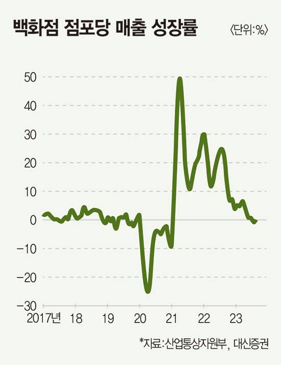 시장에선 코로나 팬데믹 저금리 때 명품 소비를 지렛대 삼아 팽창했던 백화점 성장률이 기존 추세로 제자리를 잡는 과정으로 본다. 금융투자업계에 따르면 백화점업계 연평균 매출 성장률은 2015~2019년 1%대에 불과했으나 2021년 23%, 2022년 12%로 이전 추세선을 뛰어넘어 고성장했다. 이익률이 높았던 명품 매출 감소가 뼈아픈 대목이다. 산업통상자원부에 따르면 롯데·현대·신세계백화점 해외 유명 브랜드(명품)의 전년 동월 대비 매출은 2023년 8월 7.6% 역성장한 데 이어 9월(-3.5%)과 10월(-3.1%)에도 뒷걸음질 쳤다. 2023년 명품 매출은 1월을 포함해 4번 역성장했다.