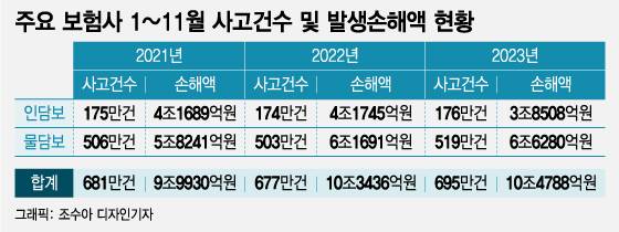 3일 손해보험업계에 따르면, 2023년 11월까지 4개 손해보험사(삼성화재·현대해상·DB손해보험·KB손해보험)에 접수된 자동차 누적 사고 건수는 695만3062건, 누적 발생손해액은 10조4788억원으로 집계됐다. 자동차보험은 4개 손보사의 점유율이 전체 85%를 차지한다.