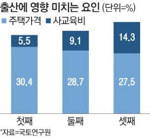 국내에서 첫 자녀를 낳을 땐 주거비 부담이 가장 큰 영향을 미치고 둘째 아이부턴 사교육비 영향이 늘어나는 것으로 나타났다. 둘째 아이 출생 가구에 부동산 공급 혜택뿐 아니라 교육비 지원도 강화해야 한다는 분석이다.
