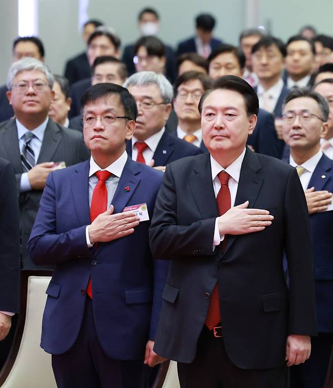 | ▲ 2024 증권ㆍ파생상품시장 개장식 참석한 윤 대통령 윤석열 대통령이 지난 2일 오전 서울 영등포구 여의도 한국거래소에서 열린 2024 증권ㆍ파생상품시장 개장식에서 국기에 대한 경례를 하고 있다. 윤 대통령 왼쪽은 최상목 경제부총리 겸 기획재정부 장관. |