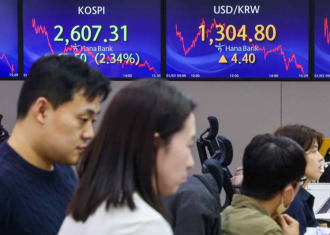 | ▲ 코스피 2% 이상 하락 마감, 원/달러 환율은 상승 3일 오후 서울 중구 하나은행 본점 딜링룸 현황판에 코스피,원/달러 환율이 표시돼 있다. 이날 코스피는 전장보다 62.50p(2.34%) 내린 2,607.31로 장을 마쳤다. |