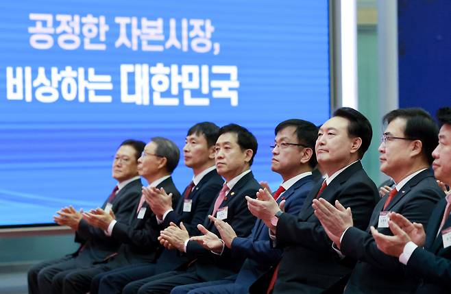 | ▲ 윤석열 대통령이 2일 오전 서울 영등포구 여의도 한국거래소에서 열린 2024 증권ㆍ파생상품시장 개장식에 참석해 박수를 치고 있다. 2024.1.2 |