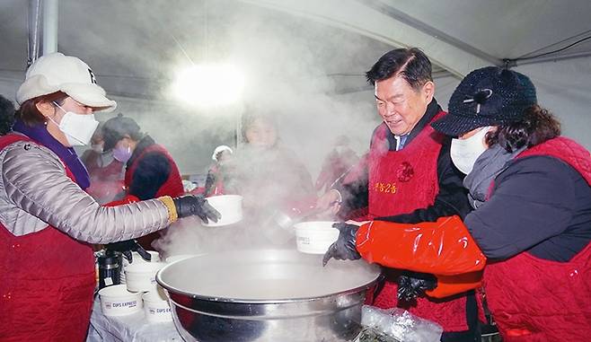 올해로 10년째 열린 배봉산 해맞이 복 떡국 나눔 행사자리다.