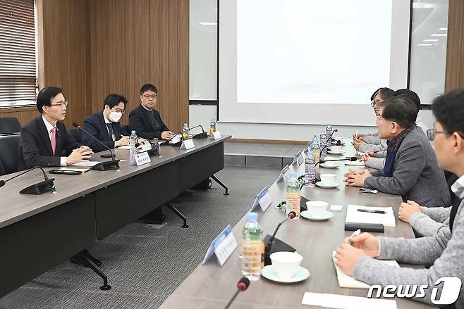 (서울=뉴스1) = 방문규 산업통상자원부 장관(왼쪽 첫 번째)이 4일 경기도 안성시 반도체 소부장 특화단지에 입주한 코미코 반도체 세정공장을 방문, 관계자로부터 공장 운영현황 및 애로사항을 듣고 있다. (산업통상자원부 제공) 2024.1.4/뉴스1