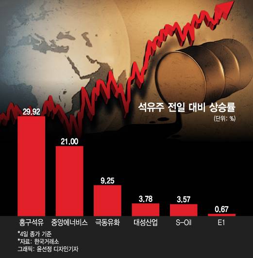 중동발 지정학적 긴장 고조로 세계 석유 공급에 차질이 생길 수 있다는 우려가 확산하자 국내 관련주들이 4일 급등했다.